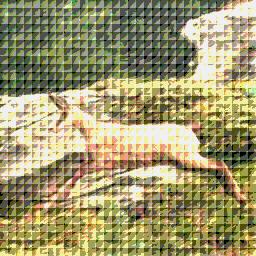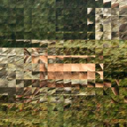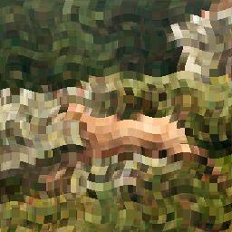 | Inverted: Each little block is a central symmetry of the source's. I obtained this with the same equation y-(x%16) as the previous one, but doubled the modulo. Then, instead of reading always the same pixel, inside one block, we read backward...